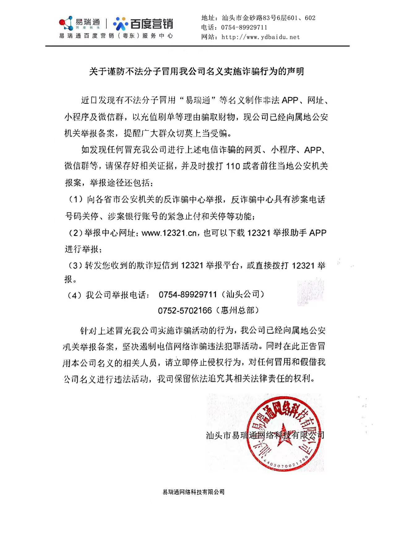 近期,我司發(fā)現(xiàn)社會上有不法個體、人員盜用我司品牌或公司名稱進(jìn)行誤導(dǎo)性宣傳、開發(fā)市場并進(jìn)行非正當(dāng)業(yè)務(wù)往來,該類行為皆屬其個人(或團(tuán)隊)行為,不代表本公司,本公司不承擔(dān)任何法律責(zé)任。并且該行為已經(jīng)嚴(yán)重誤導(dǎo)了消費(fèi)者及我司客戶,嚴(yán)重?fù)p壞我司利益及聲譽(yù)。為避免造成廣大社會朋友的損失,惠州總部、汕頭分部、潮州分部三家公司發(fā)出以下公告: